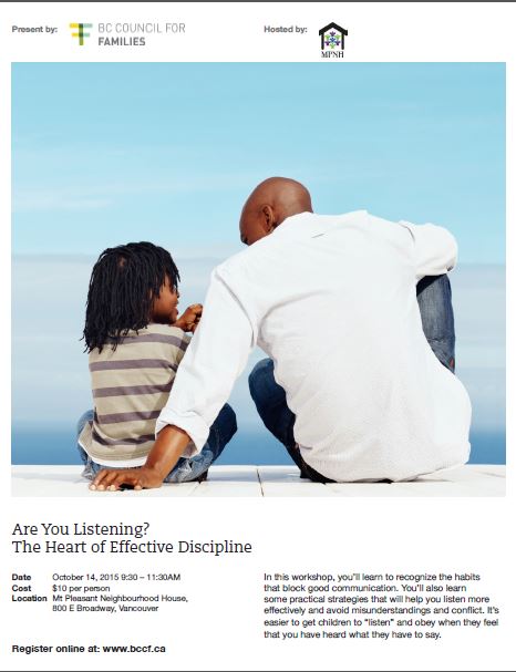 In this workshop presented by the BC Council for Families and hosted by Mount Pleasant Neighbourhood house, participants will learn: