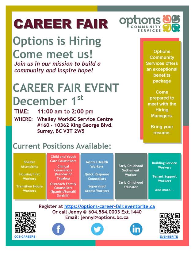 Register at https://options-career-fair.eventbrite.ca or call Jenny @ 604-584-0003 Ext. 1440, e-mail jennyl@options.bc.ca