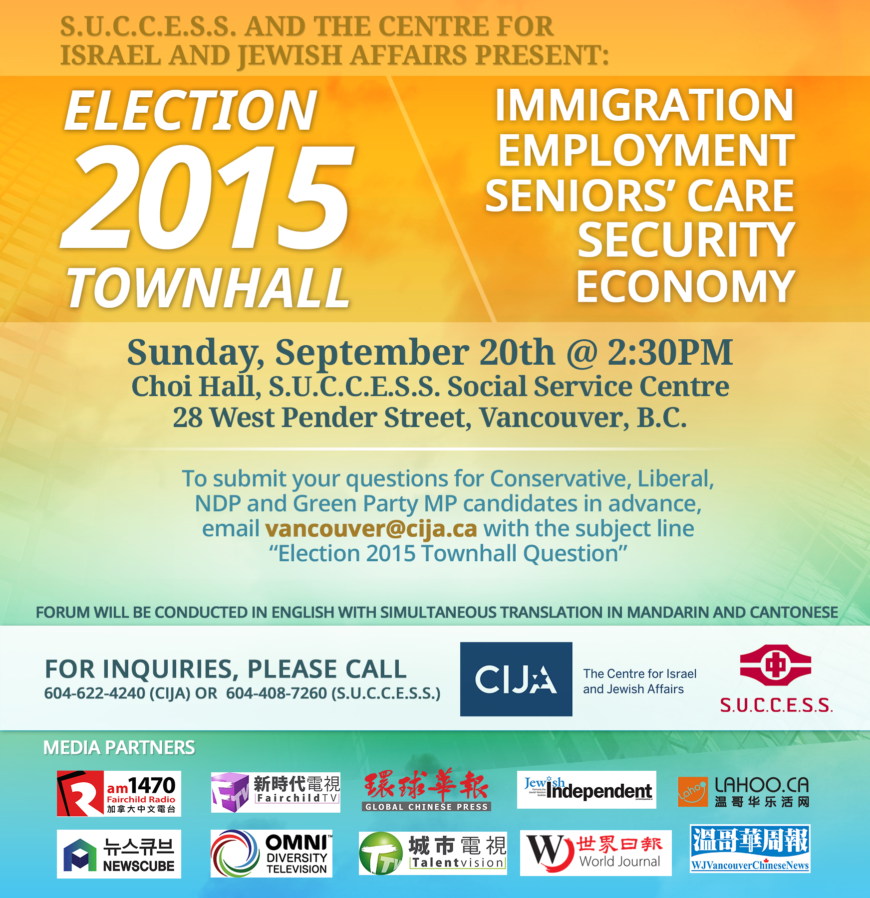 S.U.C.C.E.S.S. and The Centre for Israel and Jewish Affairs presents “Election 2015 Townhall”