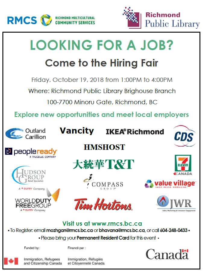 Join Richmond Multicultural Community Services and the Richmond Public Library for the Hiring Fair on October 19, 2018 from 1:00 PM – 4:00 PM.