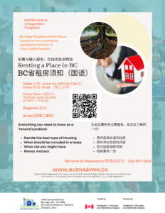 Burnaby Neighborhood House is organizing a Workshop on Renting in BC for Chinese newcomers.