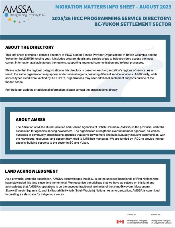 AMSSA is excited to announce the release of the 2025/26 IRCC Programming Service Directory for the BC-Yukon Settlement Sector. This